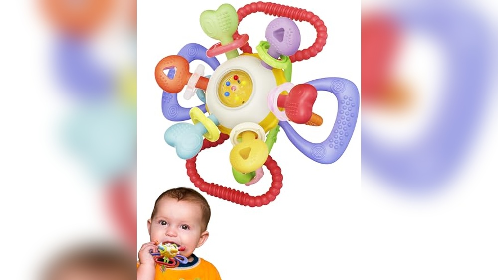 One of the Best Toys for Infants 0-12 Months, this sensory teether helps soothe gums while encouraging early motor skill development.