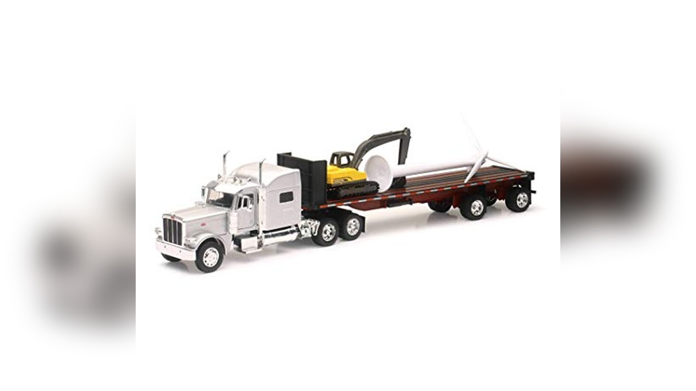 This NewRay Peterbilt 389 Truck with Flatbed Trailer is a detailed diecast model designed for kids who enjoy trucks and construction-themed toys. It features a silver metallic finish and comes with an excavator and wind turbine, making it a versatile and engaging addition to any collection of kids’ play trucks.