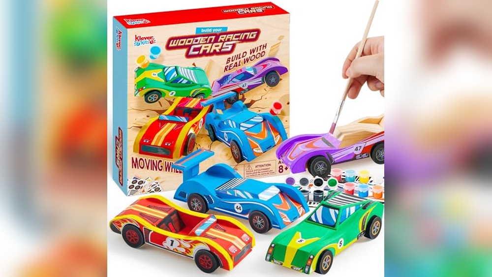 The Klever Kits Wooden Race Cars Craft Kit offers a hands-on experience for kids to build and paint four wooden race cars. This kit includes pre-cut wooden pieces, vibrant paint tubs, brushes, and racing stickers, all designed to encourage creativity and fine motor skills. It’s a complete package that supports imaginative play and learning through crafting.