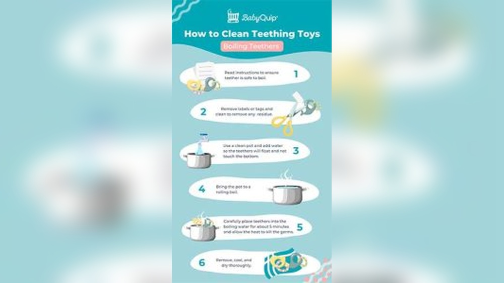 Boiling water kills most germs on teething toys. Boil a pot of water and place the toy inside for 3 to 5 minutes. Remove carefully and let the toy cool down. Avoid boiling toys with electronic parts or soft materials that can melt.